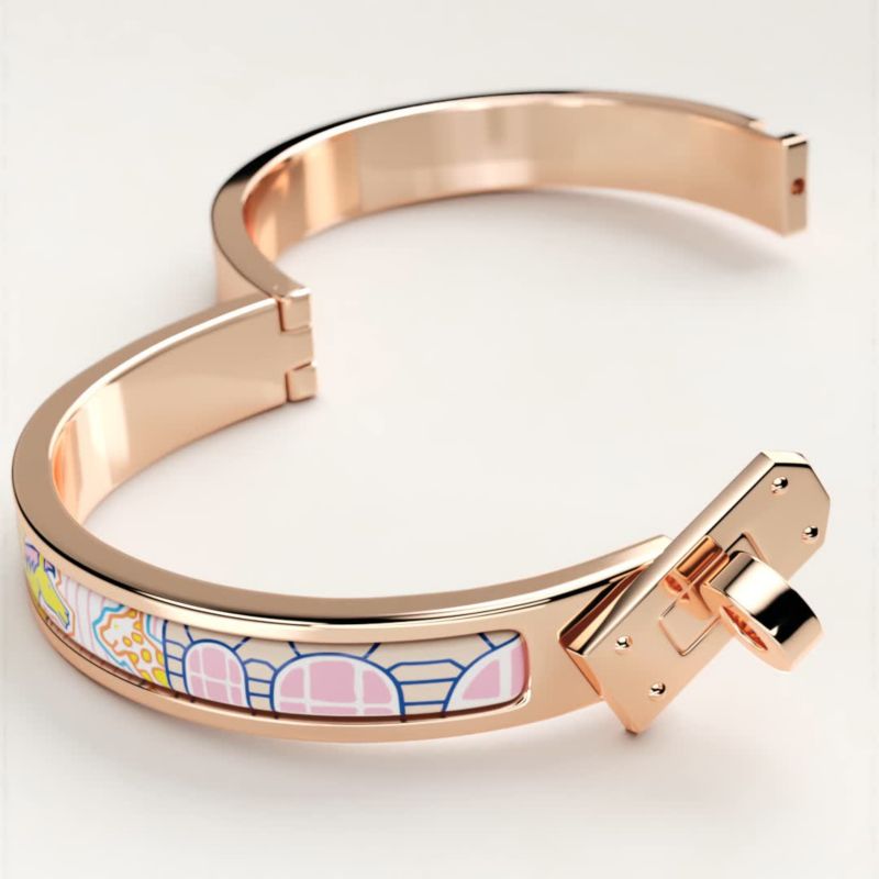 To open and close your Hermès bracelet, follow these three steps. 1. Carefully slide it over your wrist. 2. Push both ends together to close. 3. Rotate the "H" of the clasp until straight. And Click!