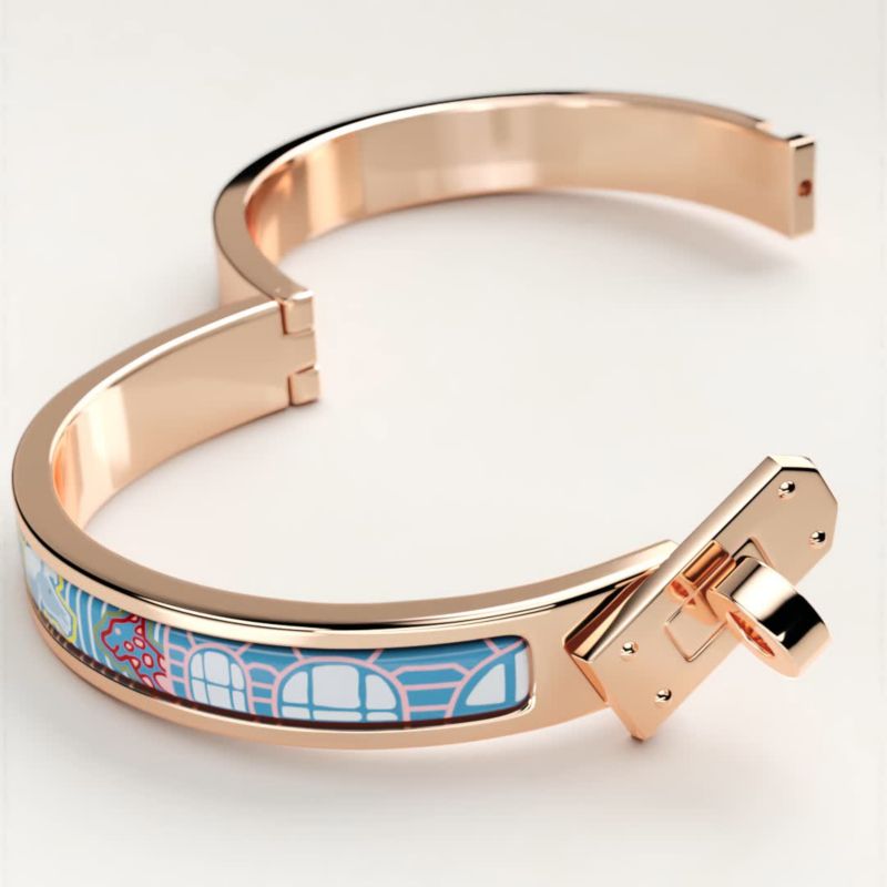To open and close your Hermès bracelet, follow these three steps. 1. Carefully slide it over your wrist. 2. Push both ends together to close. 3. Rotate the "H" of the clasp until straight. And Click!