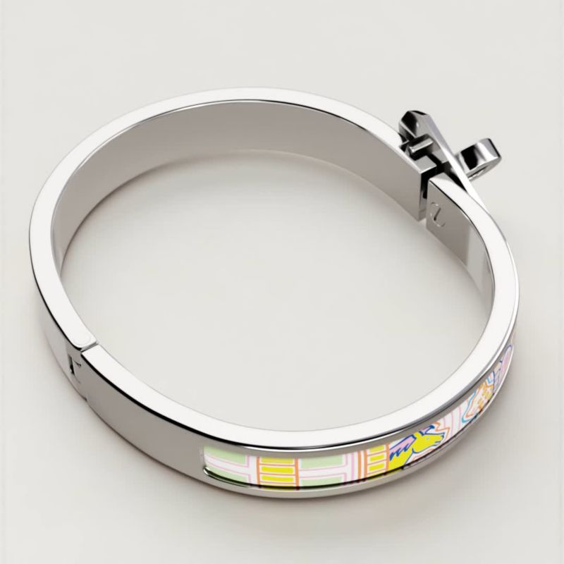 To open and close your Hermès bracelet, follow these three steps. 1. Carefully slide it over your wrist. 2. Push both ends together to close. 3. Rotate the "H" of the clasp until straight. And Click!