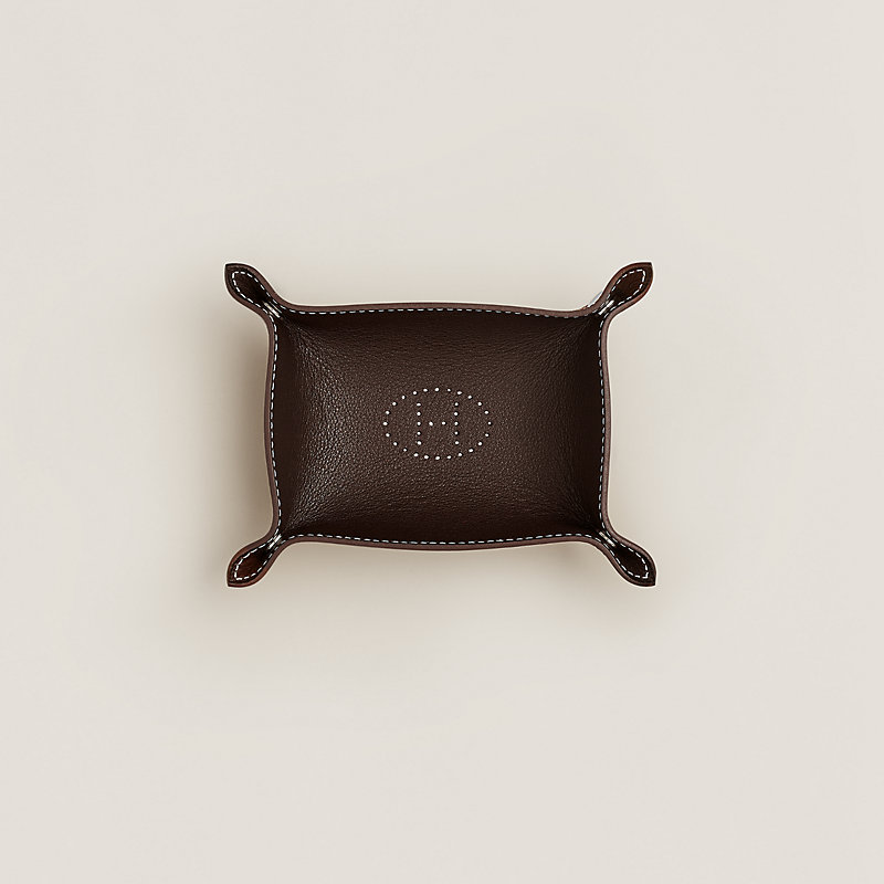 Inspired by the iconic Hermès change trays, the Mises et Relances Desk office collection returns this season with a new bicolor version in smooth Potiron orange and Fauve H taurillon leather. The iconic H Evelyne is created by perforating the center of the objects.