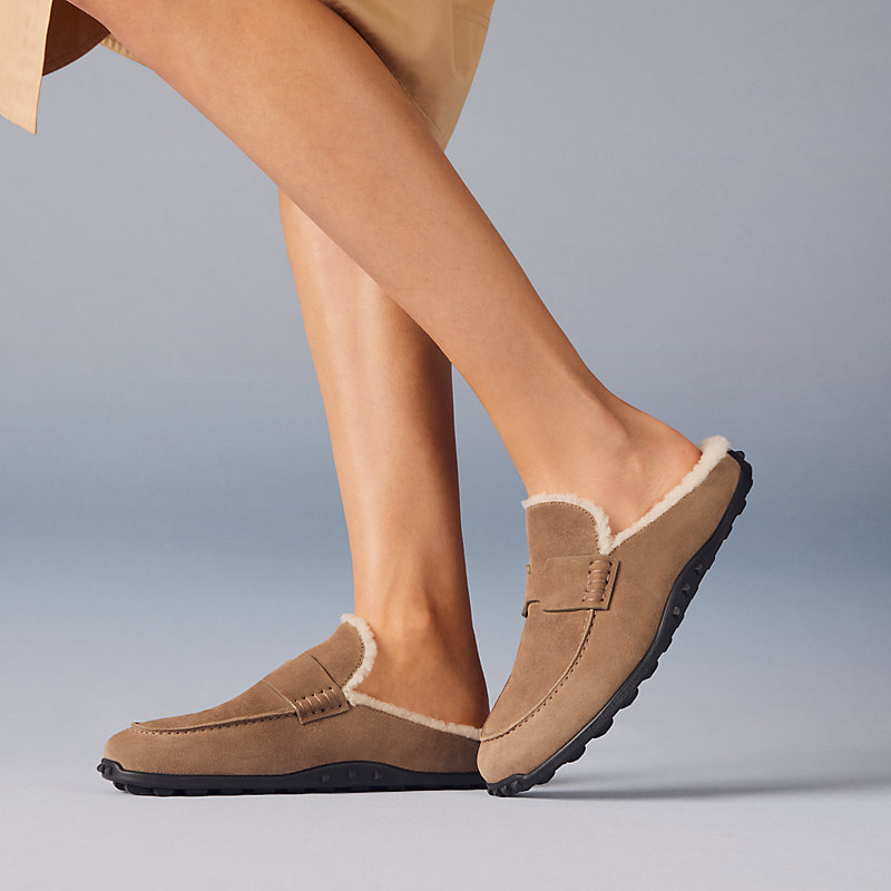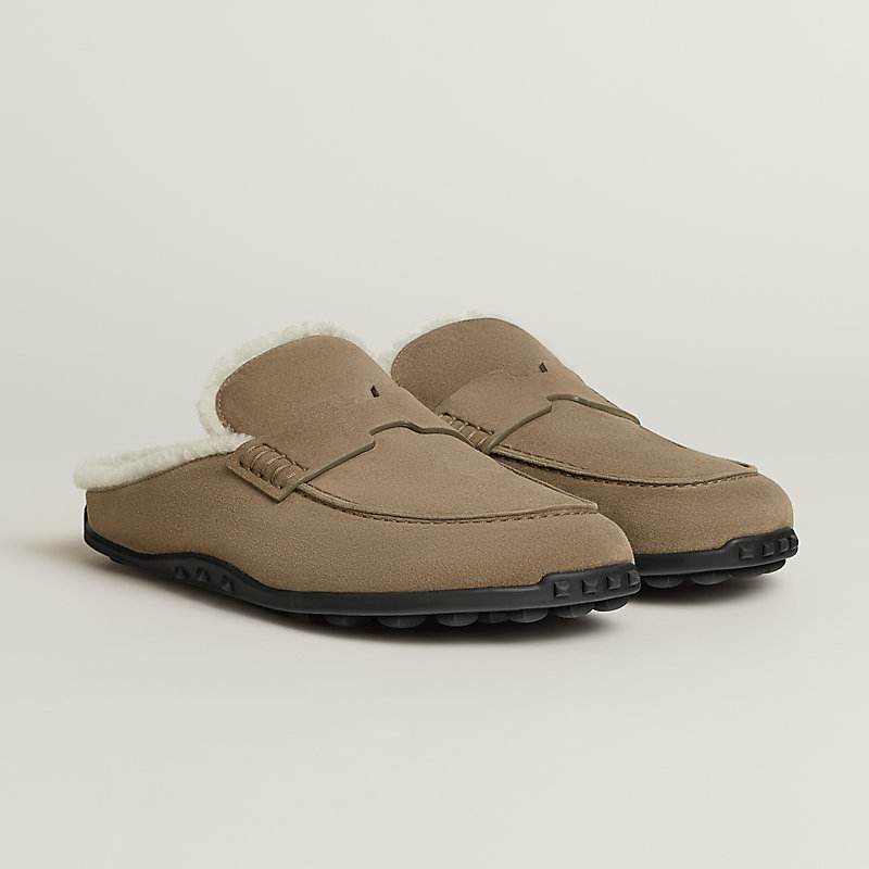 Mule in suede goatskin and shearling with iconic "H" cut-out detail and sole featuring the iconic Medor studs.