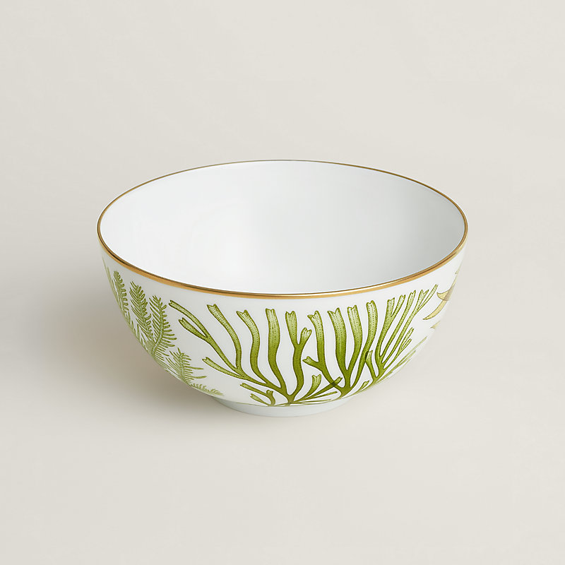 Following the contours of the porcelain teapots, plates and bowls, layers of delicate, translucent branches sway in the current. The gold rims evoke the radiance of sunbeams under the waves.