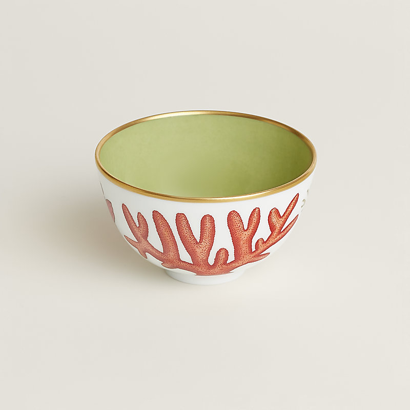 Following the contours of the porcelain teapots, plates and bowls, layers of delicate, translucent branches sway in the current. The gold rims evoke the radiance of sunbeams under the waves.
