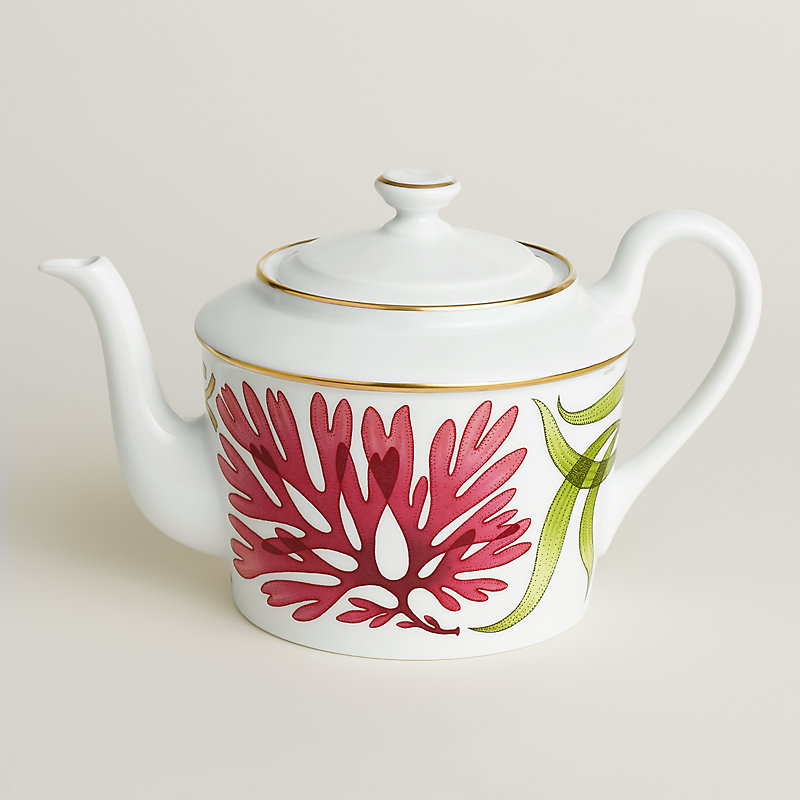 Following the contours of the porcelain teapots, plates and bowls, layers of delicate, translucent branches sway in the current. The gold rims evoke the radiance of sunbeams under the waves.