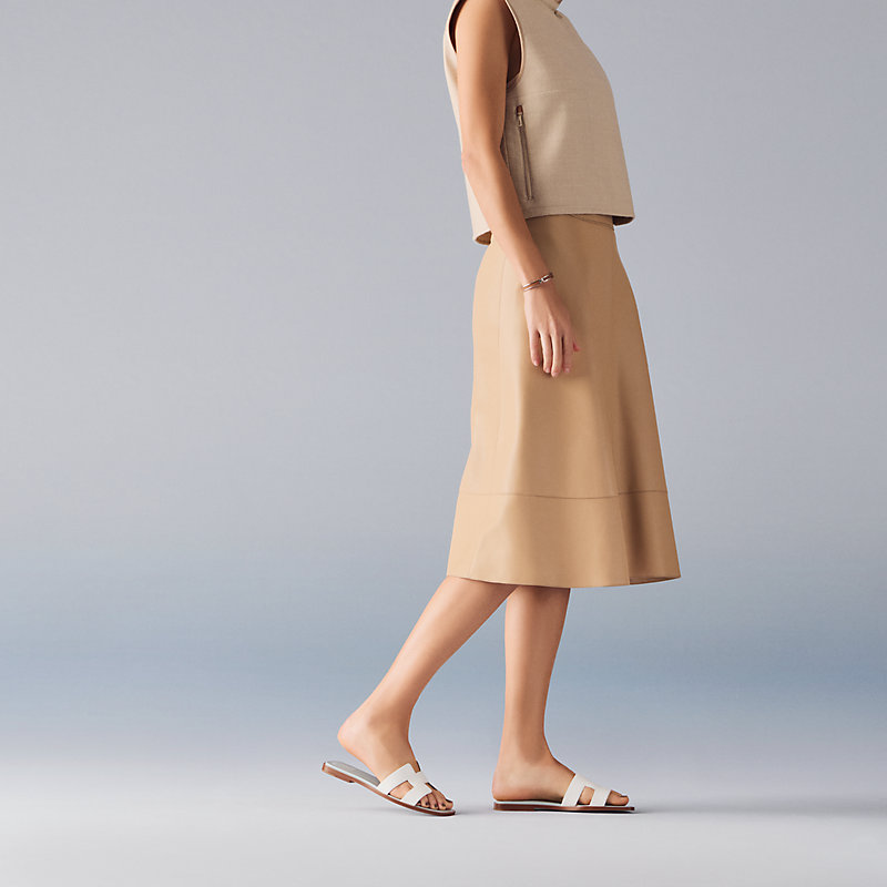 The sandal is an invitation to travel. Its journey begins on the shores of Oran, warmed by the radiant sun. Then, alive with vibrant colors and geometric lines, it makes its way between Ndebele houses. Created in 1997 by Pierre Hardy and enhanced by the iconic H cut, its style is minimalist and timeless. From one collection to the next, this summer icon is constantly reimagined in a multitude of colors and materials.