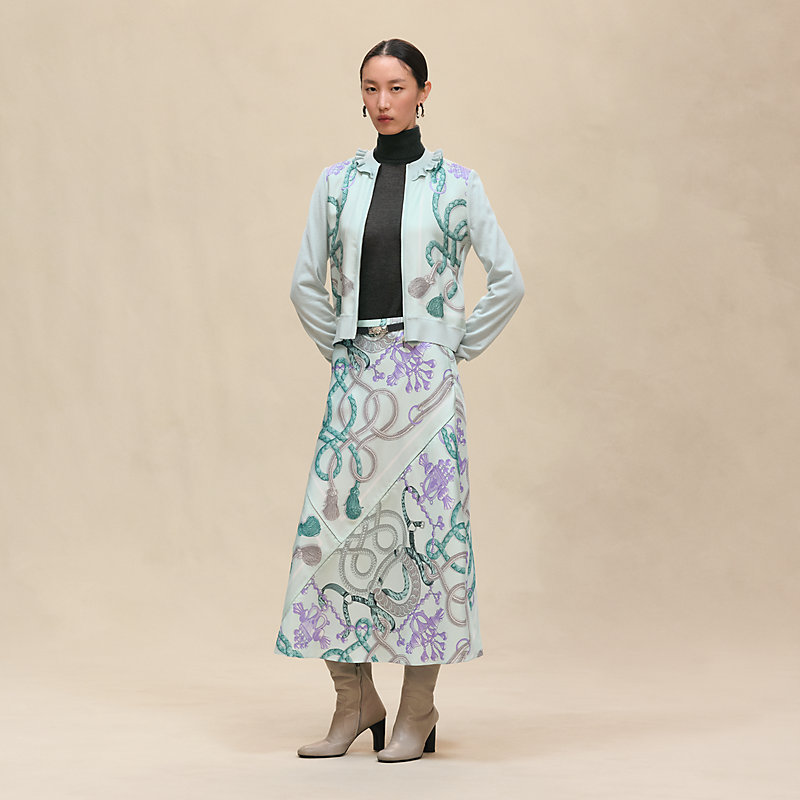 Long-sleeve twillaine cardigan in cashmere, silk and scarf with "Palefroi Remix" printed silk (49% cashmere, 48% silk, 2% polyamide, 1% elastane)