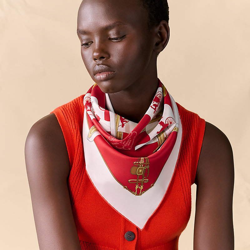 We can almost hear horses trotting and the rolling of carriages, coaches and coupes resonating on the cobblestones of the capital, such is the precision and realism of Hugo Grygkar's horse-drawn vehicles. As if in motion, the horses and carriages parade across the silk of this bold scarf. Designed by the artist in 1951, the Paris of Napoleon III vibrates and crosses through time, defying the years with its contemporary and dynamic composition.