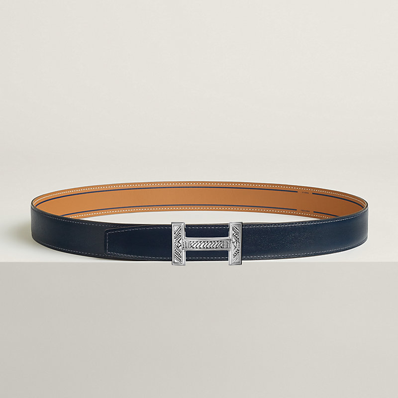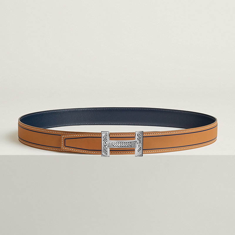 & Reversible leather strap in printed Swift and Box 135 calfskin. The Contrast 32 leather strap features the typography used on Hermès posters from the 1930s, giving Art Deco vibes. The words "Hermès Paris" appear discreetly in the center of this stripe.