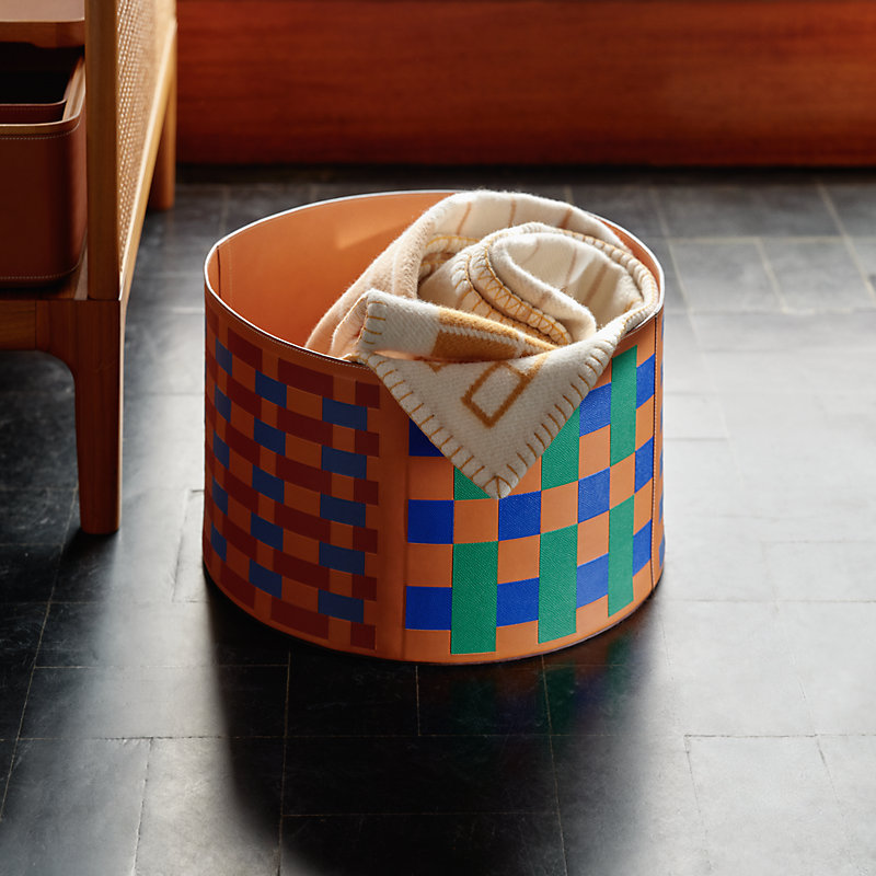 Blanket basket in hand-braided natural cowhide and Epsom calfskin