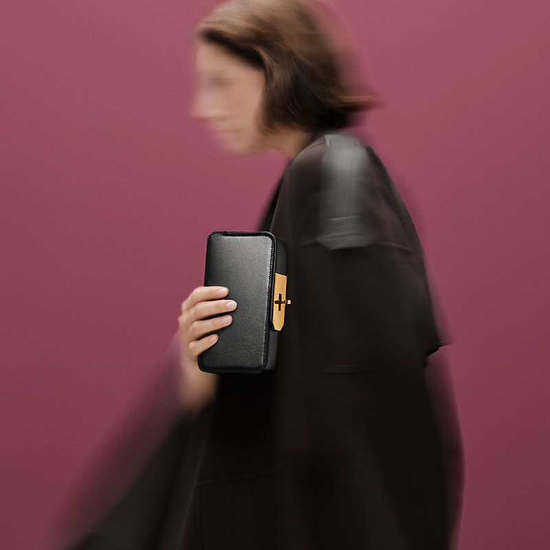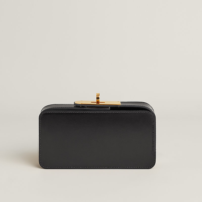 This minaudiere boasts one of the signature details from the Birkin and Kelly collections: its straps. Its sleek box-shaped silhouette highlights its maxi format, all the way down to its turn clasp, which has been adapted to the size of the leather design. A true reflection of the Maison's expertise, this minaudiere showcases the corner stitching and beading of the metal plates. Ultra-feminine, it can be opened with one hand and holds a mirror in its flat inside pocket. An essential for an elegant evening look.