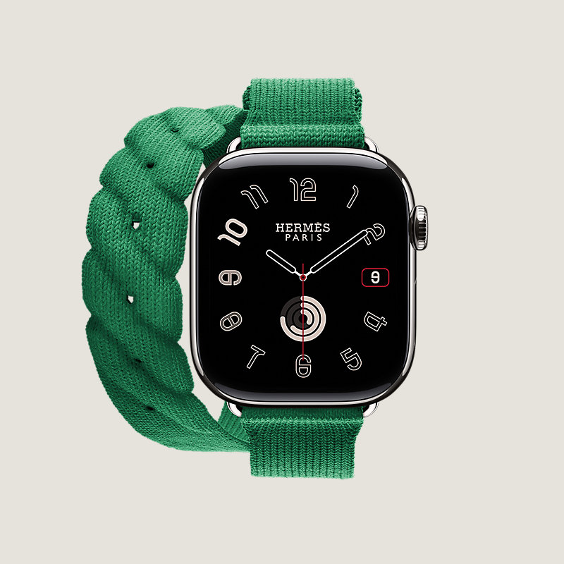 Apple Watch Hermes Series 11 case in titanium 42 mm & Double tour band in Vert Moyen knitted nylon