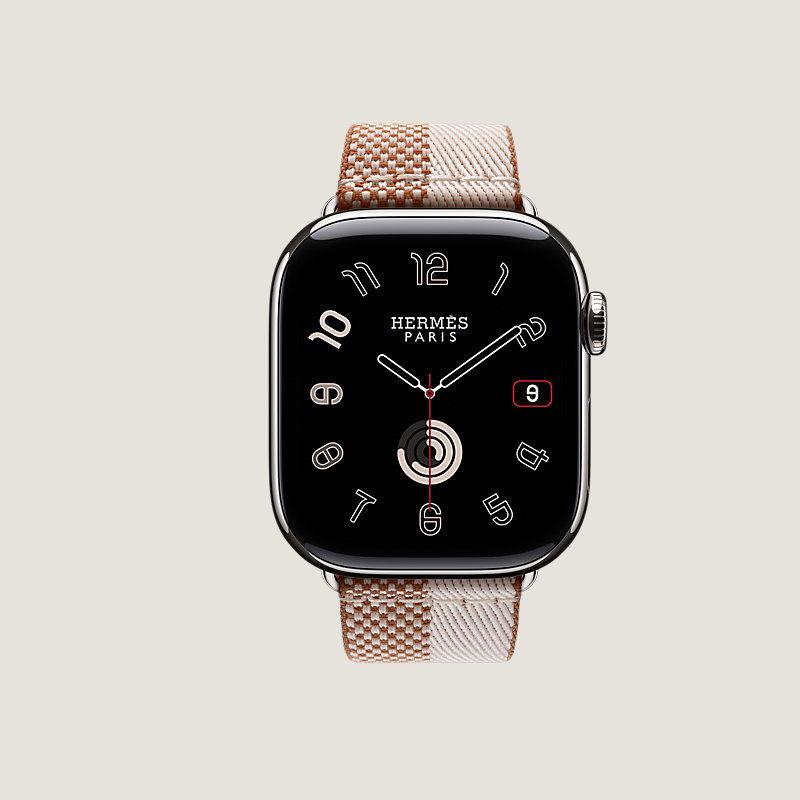 Apple Watch Hermes Series 11 case in titanium 42 mm & Single tour band in Gold/Ecru woven nylon