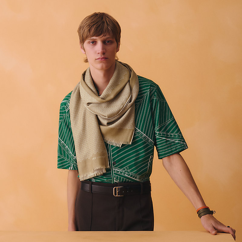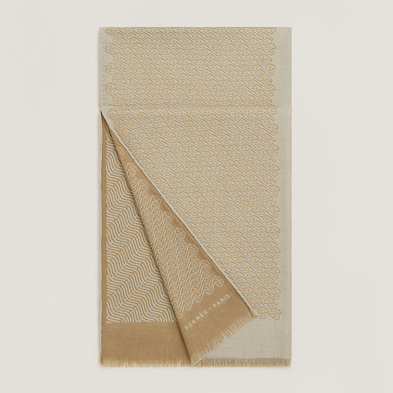 Two wave-inspired motifs, designed by Philippe Mouquet, emerge through the weaving of this reversible scarf.