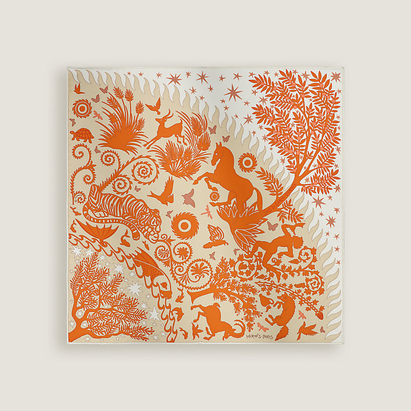A tiger, a peacock, a bull, and a python, along with a centaur and winged horse… all the animals of Greek mythology form a joyful ring around five ancient trees: an olive tree, bay tree, pomegranate, apple and Aleppo pine—each one charged with symbolism. Some dance, while others sleep under a starry sky. Orpheus, a disciple of both Dionysus and Apollo, also the protagonist of this scarf, is a master of extravagance, as well as wine, wisdom, music and rhythm. He is the poets' poet, a shaman and magician who can bewitch the world with his lyre and move with the gods of the underworld.