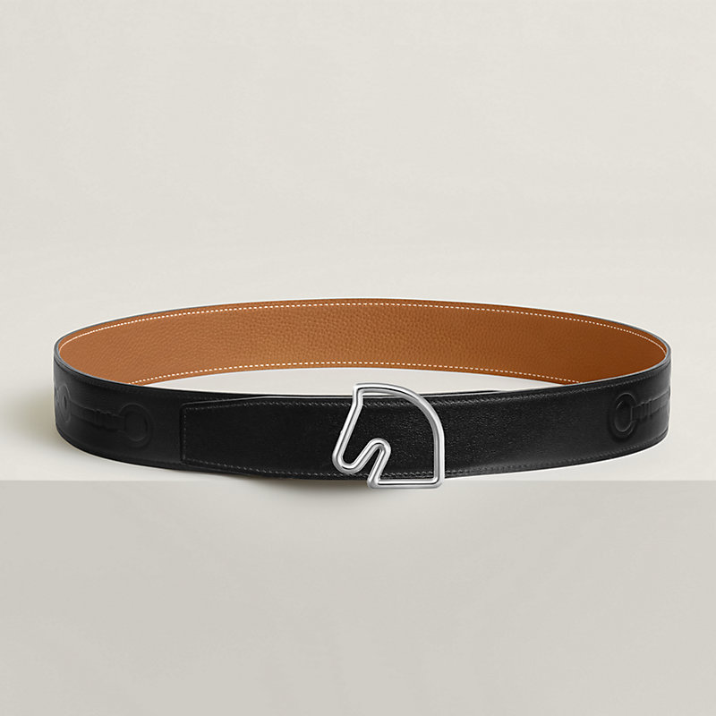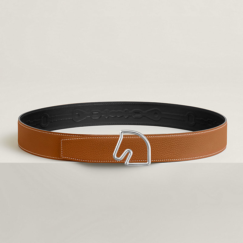 & Reversible leather strap in 135 and Togo calfskin with embossed Coaching motif, inspired by the eponymous scarf. The high-frequency know-how allows the design to be elegantly and discreetly printed on the leather strap.