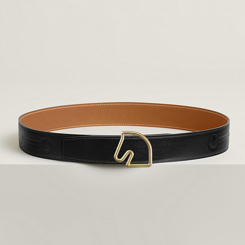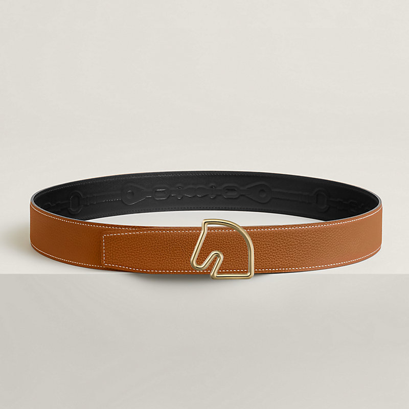 & Reversible leather strap in 135 and Togo calfskin with embossed Coaching motif, inspired by the eponymous scarf. The high-frequency know-how allows the design to be elegantly and discreetly printed on the leather strap.