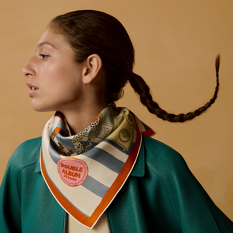 Just one knot is enough to change the fabric’s entire tone. Here, no collar or shirt—just a perfectly tied touch of flair. The scarf 70 frees the front to reveal a triangle draped across the back. Elegance in the details, nonchalance as a signature.