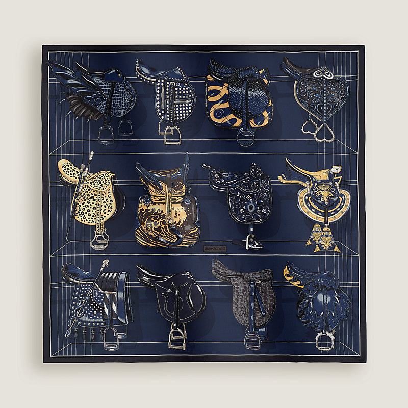 Enhanced by fine glass beads delicately embroidered, the fascinating saddles appear on the nocturnal coloring of this precious scarf.