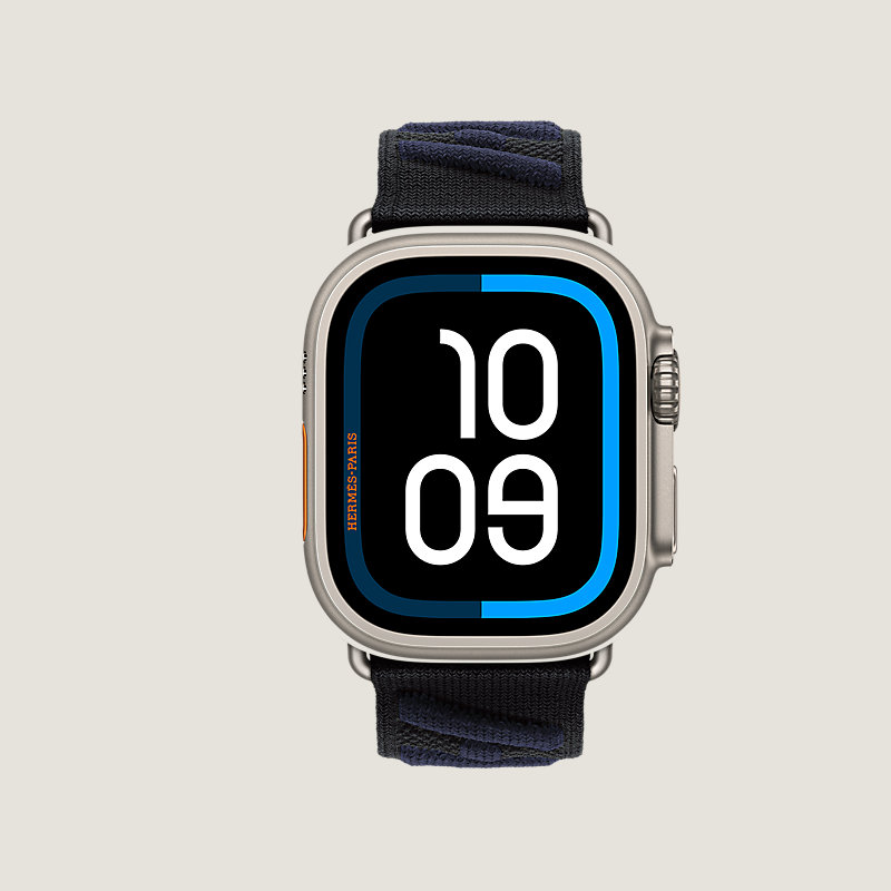 Apple Watch Hermes Ultra 3 case in titanium 49 mm & Single tour band in Noir/Bleu Nuit knitted nylon
