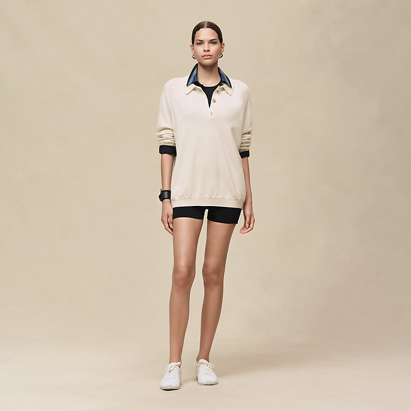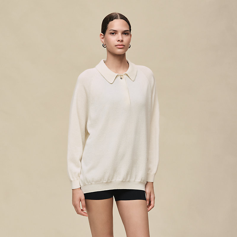 This cashmere knit is made by Hermes from threads selected for their exceptional quality. Its long and silky natural fibers provide the garment with softness, lightness and thermal comfort. To preserve its beauty, we recommend that you take several precautions: ensure that your jewelry or accessories do not catch your garments threads and store your garment lying flat, away from light and humidity.