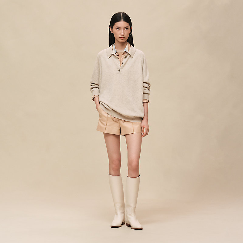 This cashmere knit is made by Hermes from threads selected for their exceptional quality. Its long and silky natural fibers provide the garment with softness, lightness and thermal comfort. To preserve its beauty, we recommend that you take several precautions: ensure that your jewelry or accessories do not catch your garments threads and store your garment lying flat, away from light and humidity.