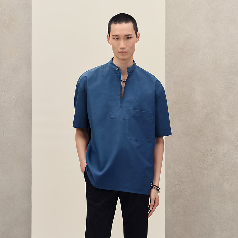 精纺棉府绸直筒宽松短袖衬衫(100%棉)。