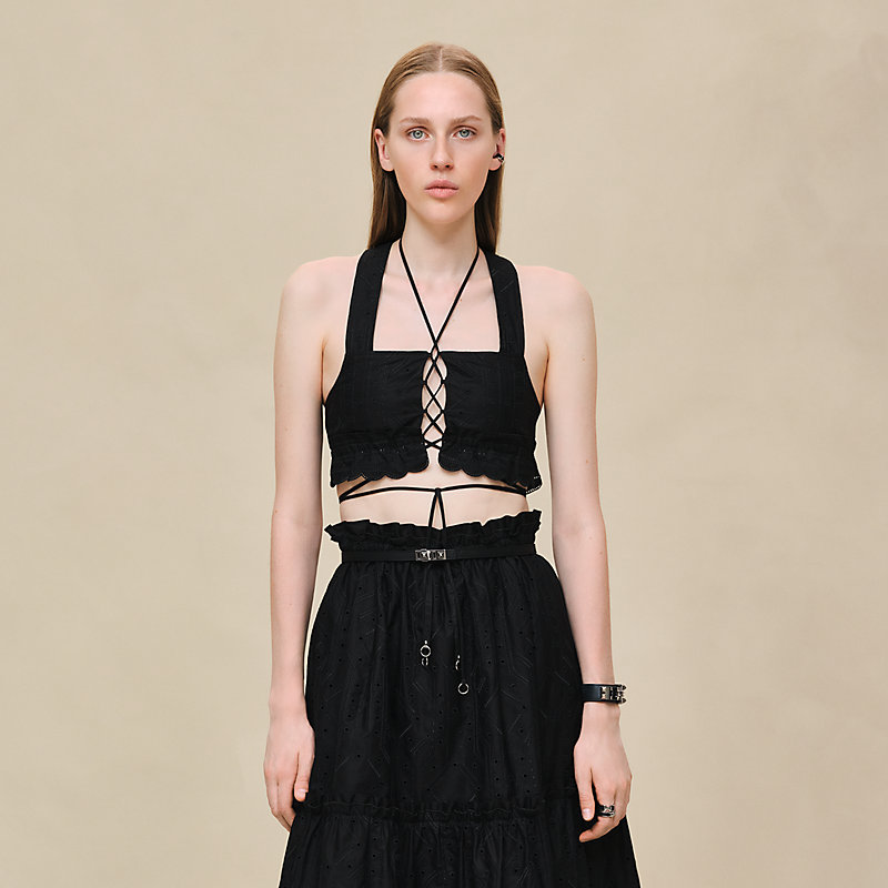 - 底边饰有镂空贴花刺绣缎带