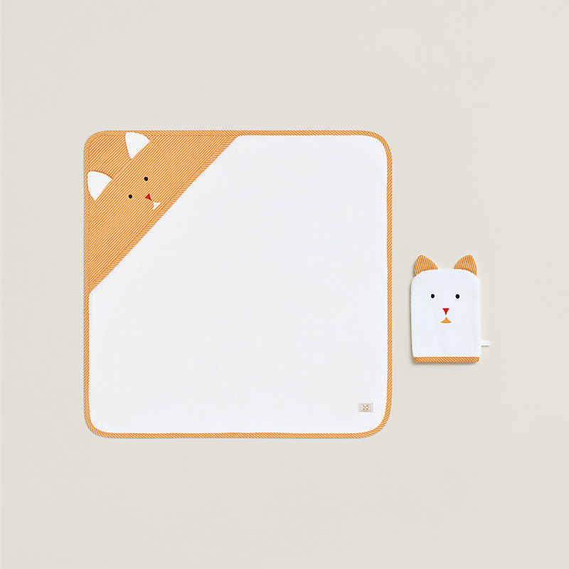 沐浴配具,含浴袍和小方巾,饰有“动物部落”刺绣图案。- 毛圈布浴袍和小方巾(100%棉)- 机器刺绣(100%涤纶)- 条纹棉质帆布饰边(100%棉)