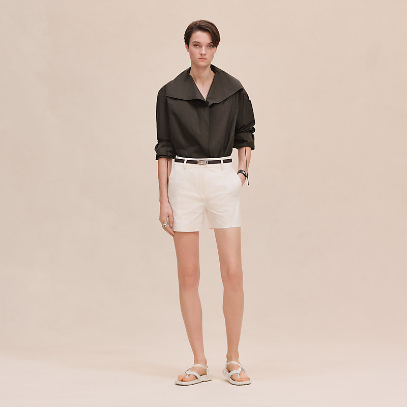 全年可穿的单品。这款棉质帆布短裤别致而随性,是衣橱主打单品,冬季可搭配羊毛裤袜,打造都市时尚造型,夏季可露腿搭配凉鞋穿着。