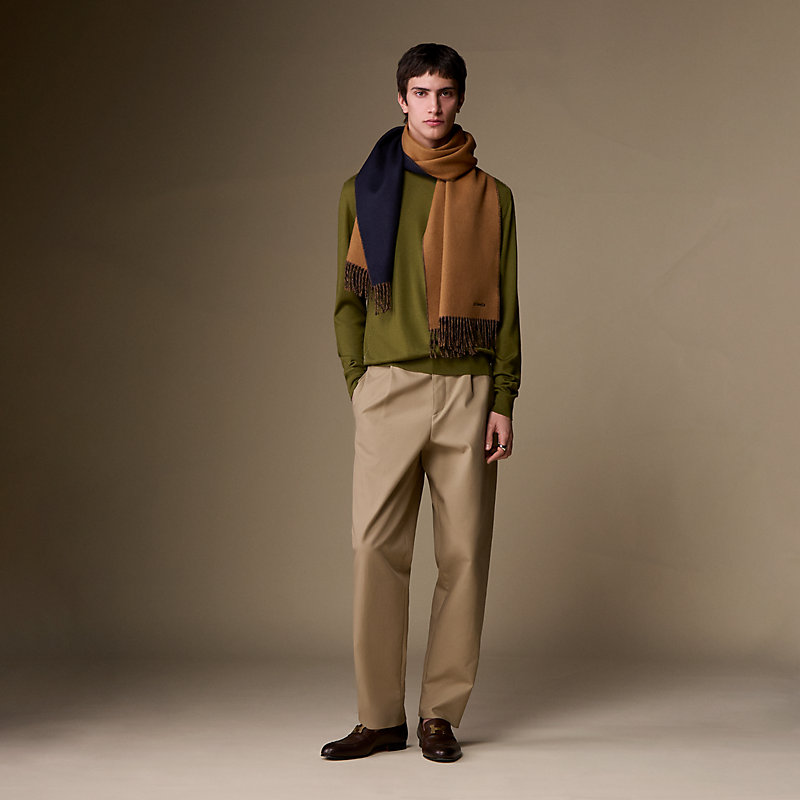 双面撞色围巾,饰有低调雅致的标志性“Hermès”刺绣。