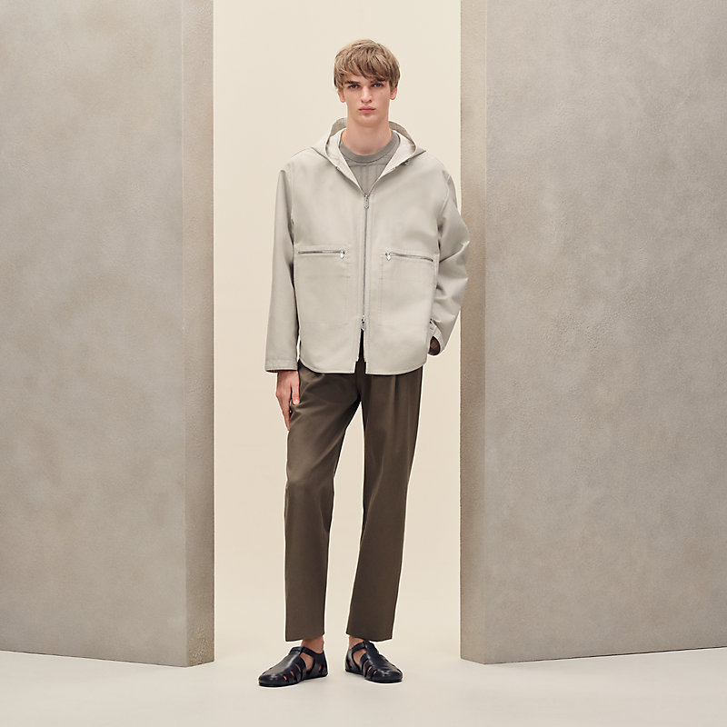 防泼水双面马德拉斯条纹织物拉链连帽夹克(一面为99%棉,1%锦纶;另一面为:100%棉)。- 兜帽配有抽绳- 双向拉链- 正面翻盖口袋,配有“Hermès Paris”字样镌刻按扣- 纯色面配有拉链正面口袋正常版型,请选择您的常规尺码。