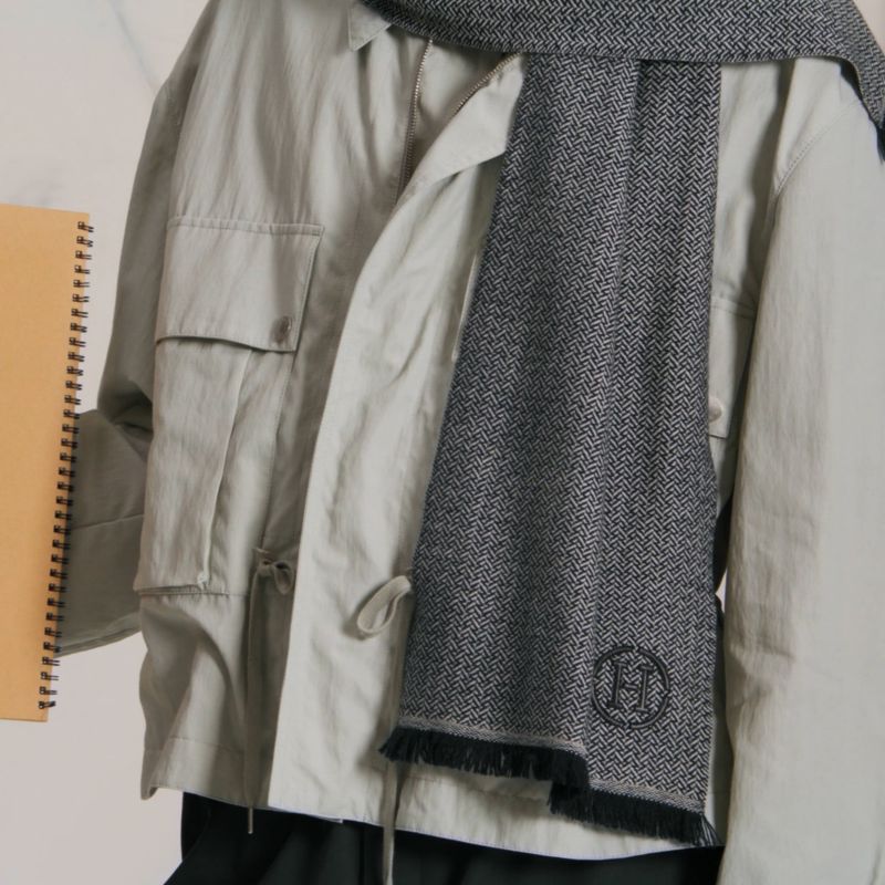 这款山羊绒围巾在尼泊尔纯手工制作,以编织工艺呈现低调的“H”字母图案,并点缀刺绣皮革“H”字样。