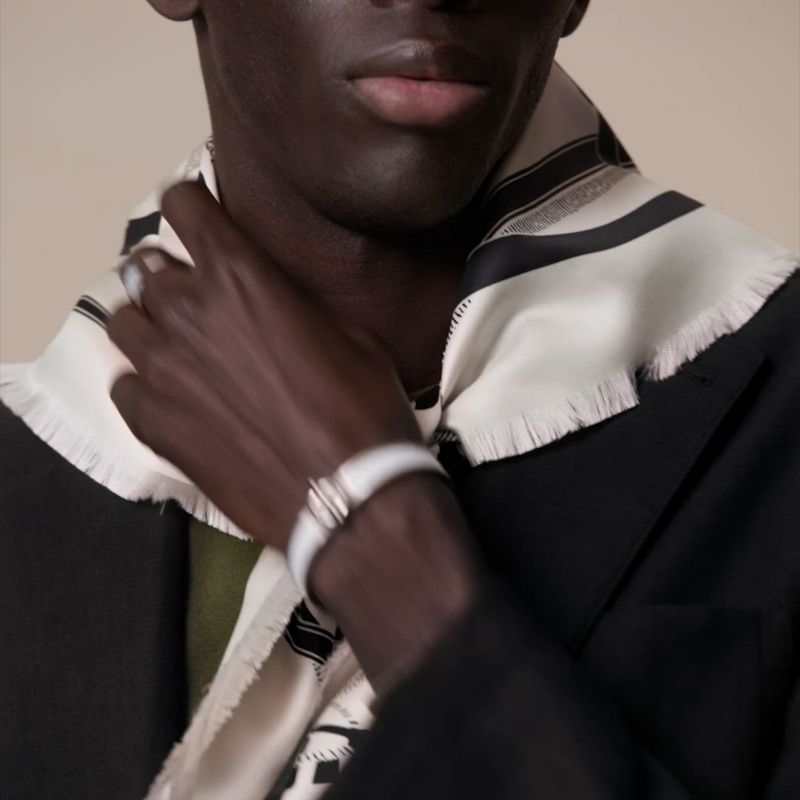 缰绳、皮革马勒及马镫的曲线和涡纹在丝巾上翩然欢舞,让人联想起著名的法国马术学校索缪尔黑骑士马术团教习的马术图形步法,马匹和骑手们要进行长时间的反复练习方能掌握这些步法。这款精巧方巾采用双色图案处理,令启发亨利·道西尼(Henri d'Origny)创作灵感的环骑、蛇形步和螺旋步更加生动醒目。