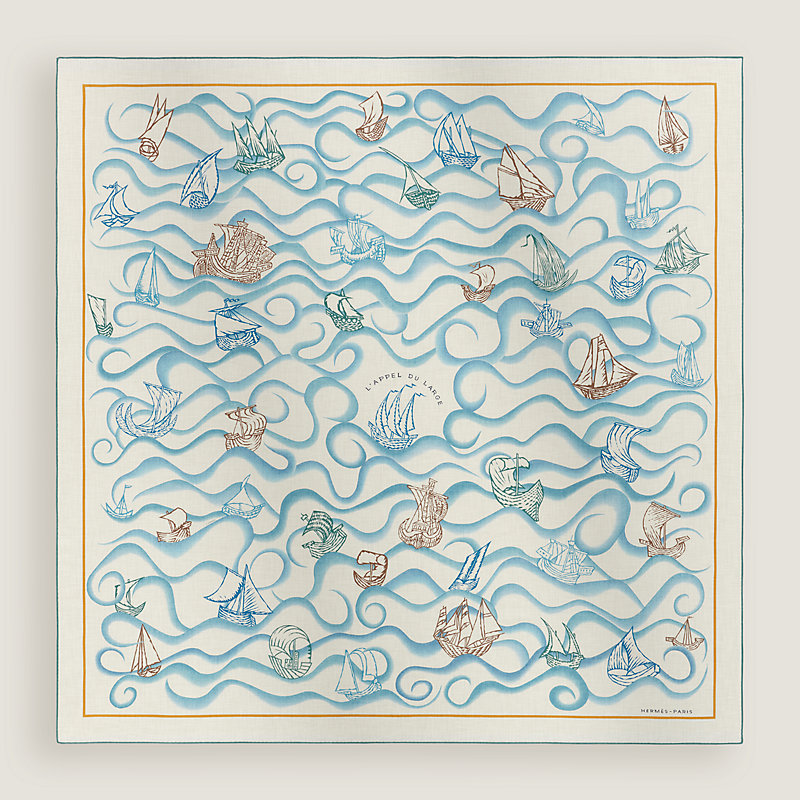 弗洛伦斯·曼里克(Florence Manlik)运用Chaine d'Ancre链环和画笔,驱策这些精巧悦目的船只扬帆启航,驶向广阔无垠的大海。在风的助力和探险热情的驱动下,来自五湖四海的船只鼓起风帆,穿越时光,汇入这款洋溢海洋气息的丝巾之中,乘着色彩斑斓的海浪航行。它们有的宛如木刻版画,有的仿佛从徽章中脱身而出,但都将我们带往目不可及的远方,奔赴辽阔的大海、地平线以及更遥远的界域。