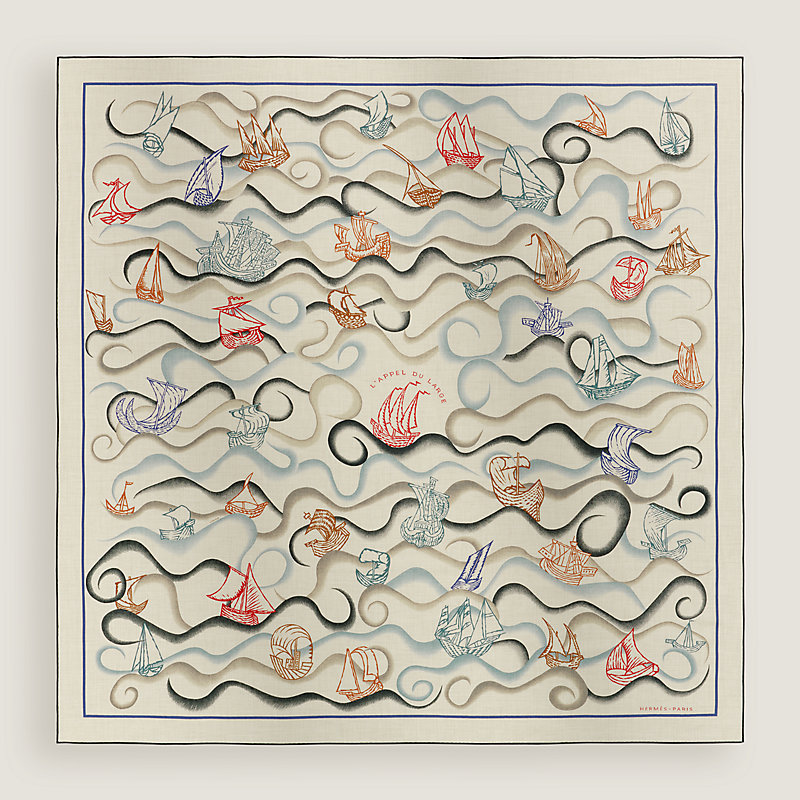 弗洛伦斯·曼里克(Florence Manlik)运用Chaine d'Ancre链环和画笔,驱策这些精巧悦目的船只扬帆启航,驶向广阔无垠的大海。在风的助力和探险热情的驱动下,来自五湖四海的船只鼓起风帆,穿越时光,汇入这款洋溢海洋气息的丝巾之中,乘着色彩斑斓的海浪航行。它们有的宛如木刻版画,有的仿佛从徽章中脱身而出,但都将我们带往目不可及的远方,奔赴辽阔的大海、地平线以及更遥远的界域。