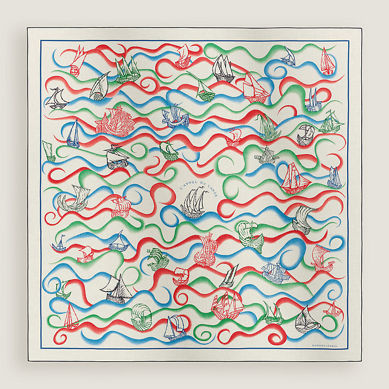弗洛伦斯·曼里克(Florence Manlik)运用Chaine d'Ancre链环和画笔,驱策这些精巧悦目的船只扬帆启航,驶向广阔无垠的大海。在风的助力和探险热情的驱动下,来自五湖四海的船只鼓起风帆,穿越时光,汇入这款洋溢海洋气息的丝巾之中,乘着色彩斑斓的海浪航行。它们有的宛如木刻版画,有的仿佛从徽章中脱身而出,但都将我们带往目不可及的远方,奔赴辽阔的大海、地平线以及更遥远的界域。