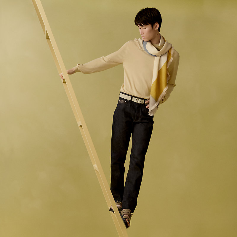 这款山羊绒方巾焕新演绎法奈特·梅利埃(Fanette Mellier)设计的“美味H”图案,由我们技艺精湛的尼泊尔工匠以扎染工艺匠心织就。