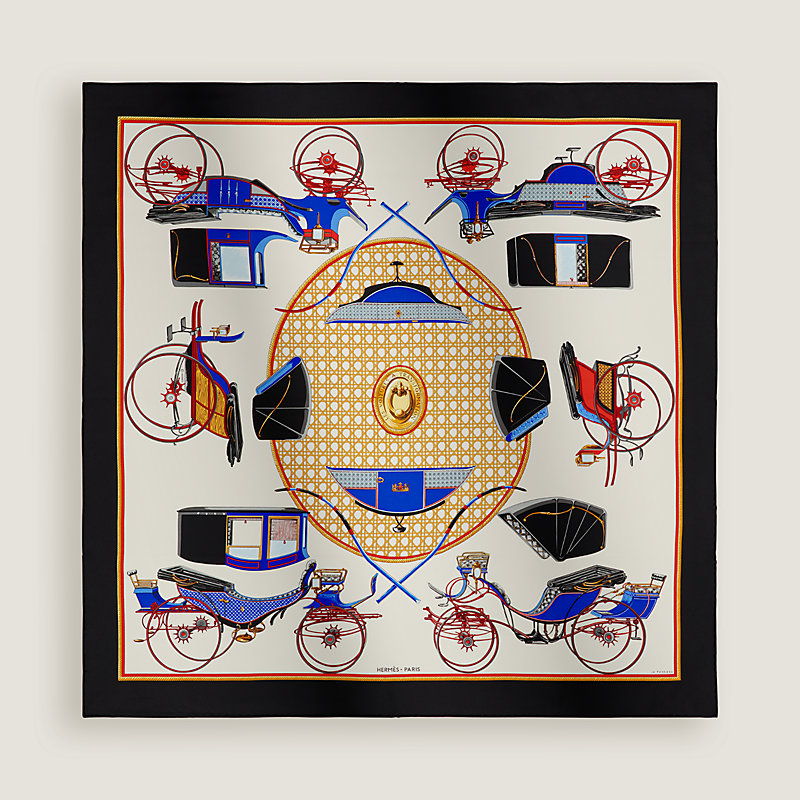 这些设有可折叠顶蓬的小型马车看起来非常轻盈,宛如长着宽大翅膀的蜻蜓,随时可以起飞。马车以柳条为装饰,通常由女性使用。非常适合在天气晴朗的时候出城游玩或去林间漫步,尽显优雅风范。这款由弗朗丝瓦·德·拉佩里(Françoise de la Perriere)设计的丝巾于1965年问世,灵感来自爱马仕钟爱的主题,带领我们展开一场穿越时光的旅程。