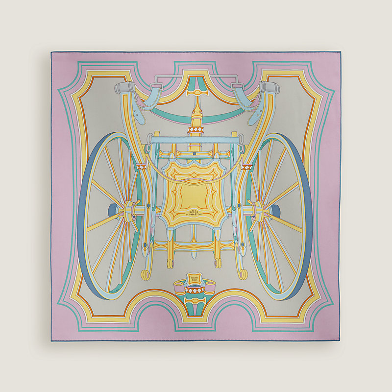 “法厄同”(phaeton)之名取自希腊神话中太阳神之子的名字,是一种在18世纪末的法国和英国盛行一时的马车。这种轻盈便捷、机动性很高的马车便于马夫在城里轻松驾驭行驶。设计师皮埃尔·马里(Pierre Marie)以透视手法呈现埃米尔·爱马仕(Emile Hermès)典藏中的法厄同马车后视图,将高大的车轮和精致的彩绘装饰定格在与马车本身结构相同的风格化八角形边框之中。这种富有几何感的嵌套效果为这辆华美的马车注入生动活力和现代感。