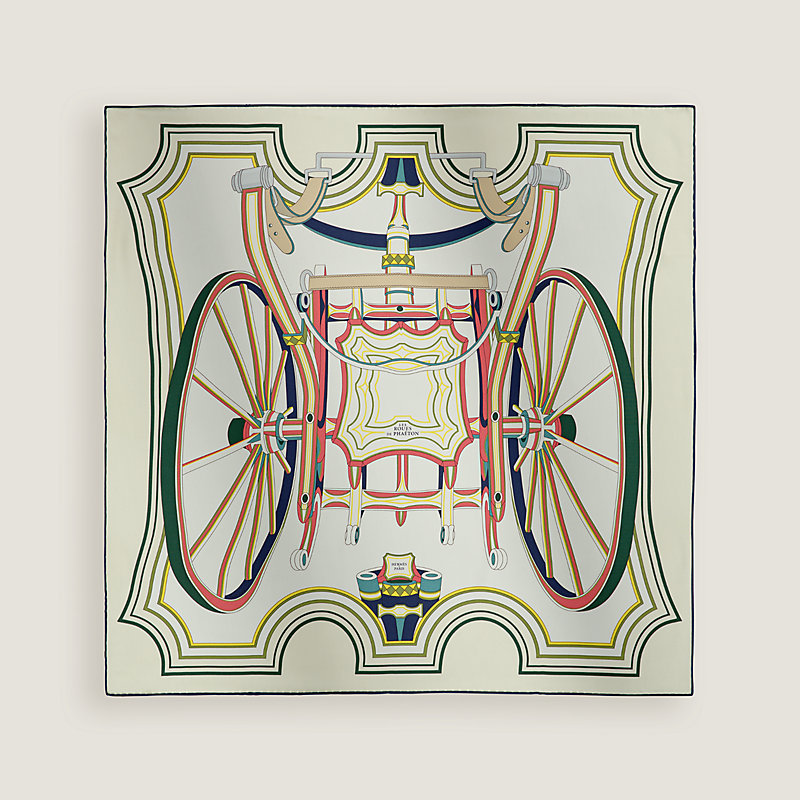 “法厄同”(phaeton)之名取自希腊神话中太阳神之子的名字,是一种在18世纪末的法国和英国盛行一时的马车。这种轻盈便捷、机动性很高的马车便于马夫在城里轻松驾驭行驶。设计师皮埃尔·马里(Pierre Marie)以透视手法呈现埃米尔·爱马仕(Emile Hermès)典藏中的法厄同马车后视图,将高大的车轮和精致的彩绘装饰定格在与马车本身结构相同的风格化八角形边框之中。这种富有几何感的嵌套效果为这辆华美的马车注入生动活力和现代感。