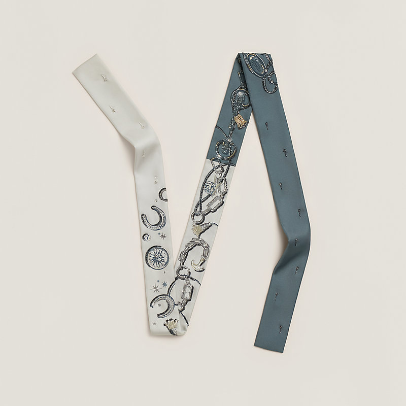 斜纹真丝缎带,饰有手工刺绣圆珠和玻璃销杆(100%桑蚕丝)。这款缎带饰有野村大辅(Daiske Nomura)设计的“派对时间到”图案印花,点缀手工刺绣圆珠和玻璃销杆,宛如宝石般闪耀。