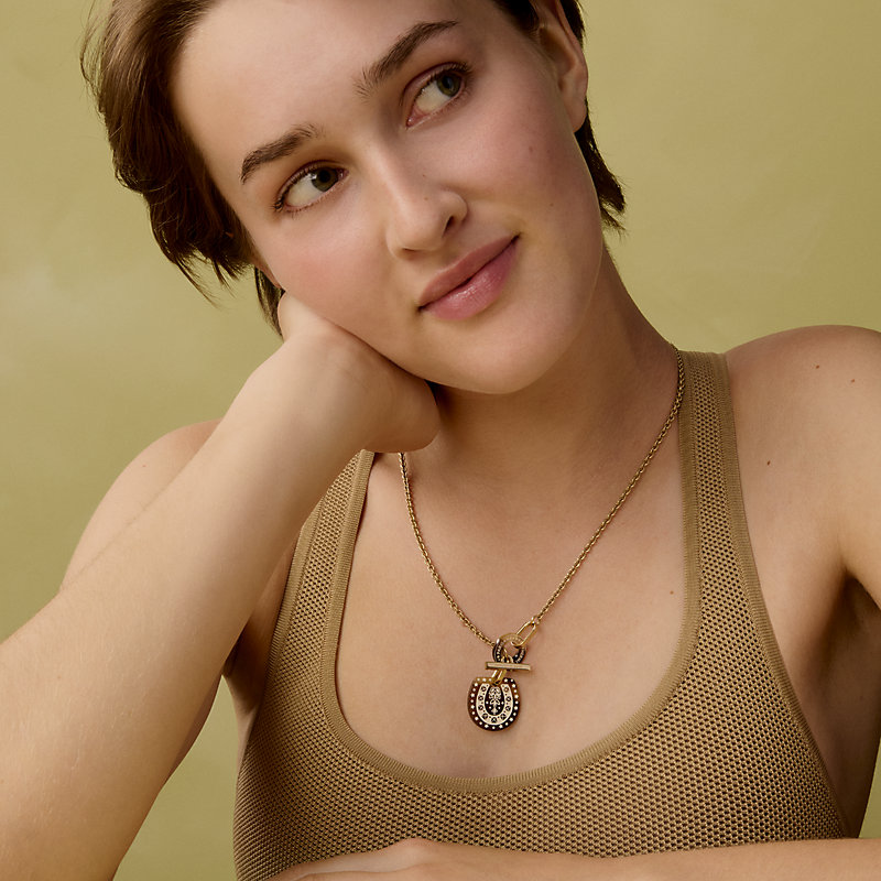 系列灵感源自方巾世界,其中野村大辅(Daiske Nomura)设计的“爱心骏马”真丝方巾影响犹深。方巾中标志性的骏马、马蹄铁和棕榈叶纹 被精心雕刻于牛角之上,继而手工上漆。金属和牛角锁扣饰有精美的方巾图案。