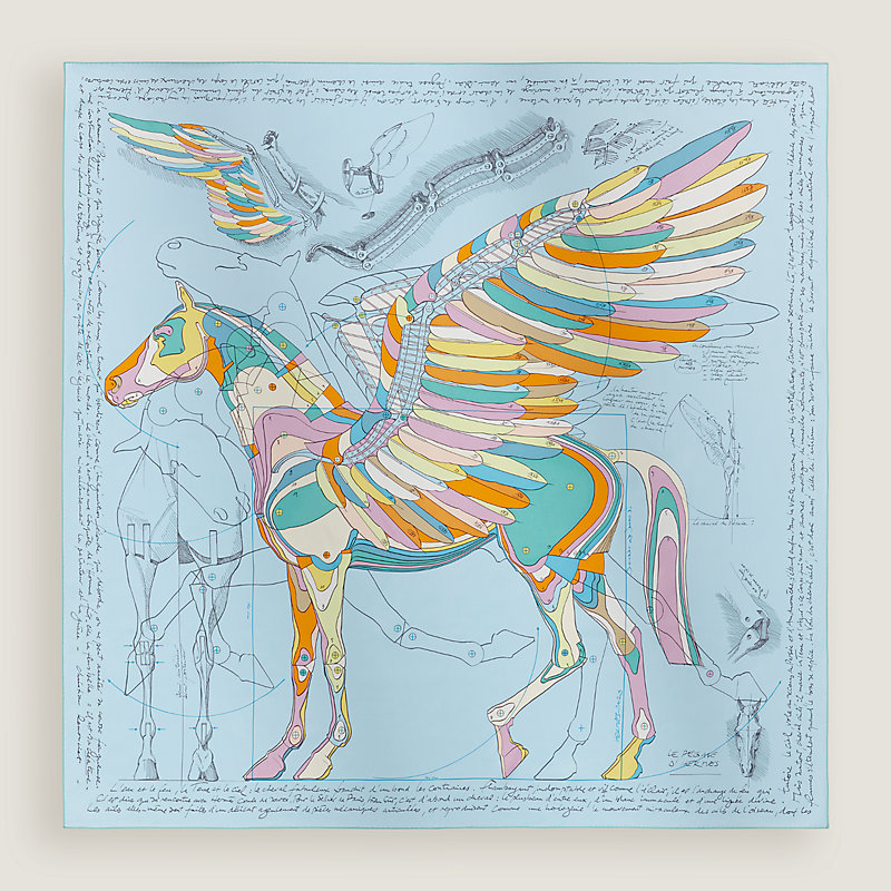 克里斯汀·勒农西亚(Christian Renonciat)从他那座以木质和金属制作的大型机械飞马雕像获得启发,创作出一幅文艺复兴风格的飞马肖像。飞马是爱马仕钟爱的动物形象。这幅图案向达·芬奇及其重新构建世界的宏大梦想致敬,成为灵感与工艺之间的纽带,颂扬人与动物、精神与物质之间的和谐共生。它承载着想象、诗意和创造力,象征整个品牌的激扬活力与腾飞。