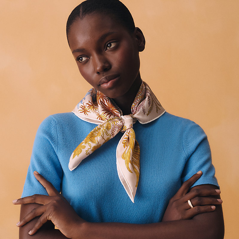 轻盈、大胆和无穷无尽的俏皮感在方巾中交织碰撞,让自己沉浸于质感迷人的丝绸之中。以多变、创意和俏皮的方式佩戴70方巾,展现时尚摩登而轻松随性的风格。