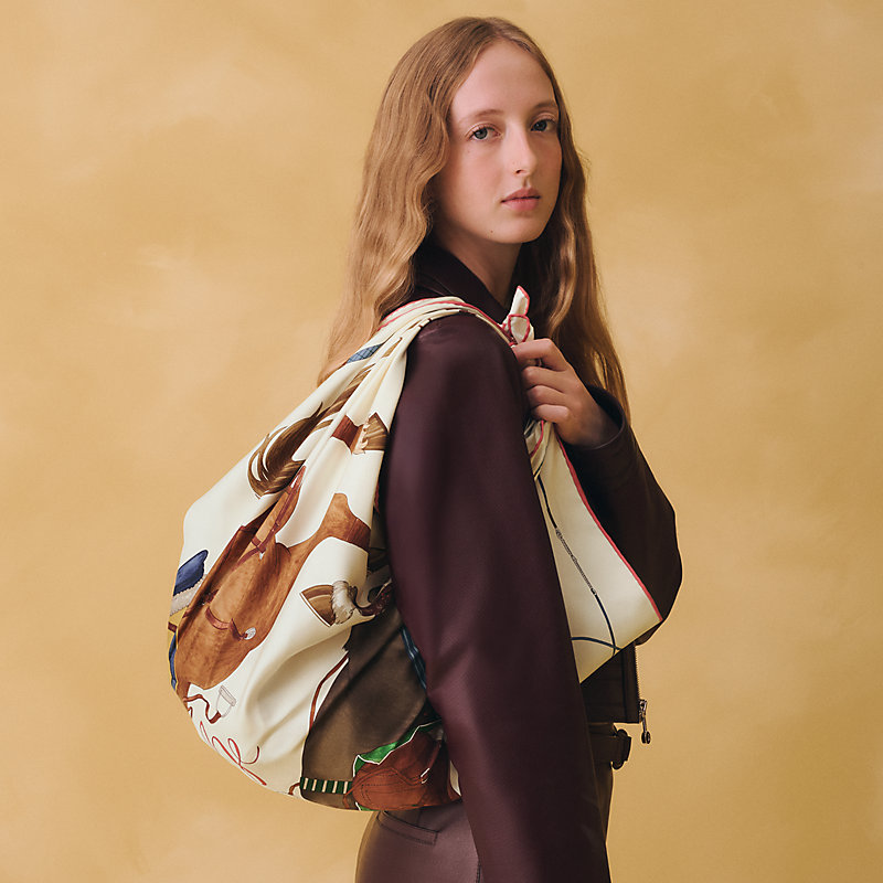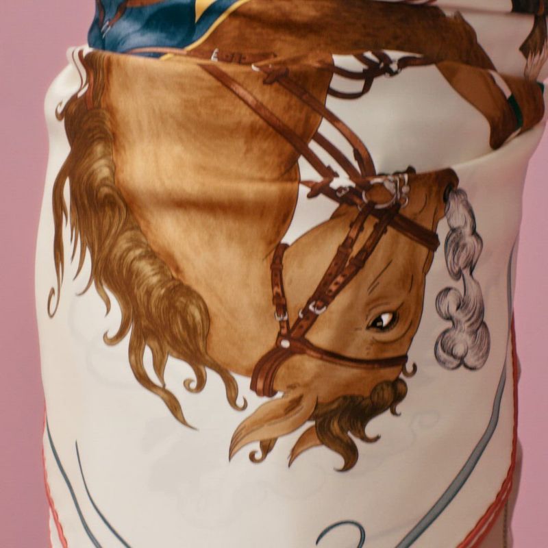 热情四溢、奔腾不羁的马儿,令缠绕着缎带的精致马鞭毫无用武之地。鞍辔、鬃毛和马镫在风中飞扬,海豹棕和栗色骏马腾空跃起,舞动一曲热烈奔放的圆舞曲。蒂博·拉萨(Thibaut Rassat)从一幅17世纪伊朗画作的细腻笔触汲取灵感,运用富有活力和现代感的线条,引领我们踏上一场令人屏息、斑斓绚丽的欢腾旅程。