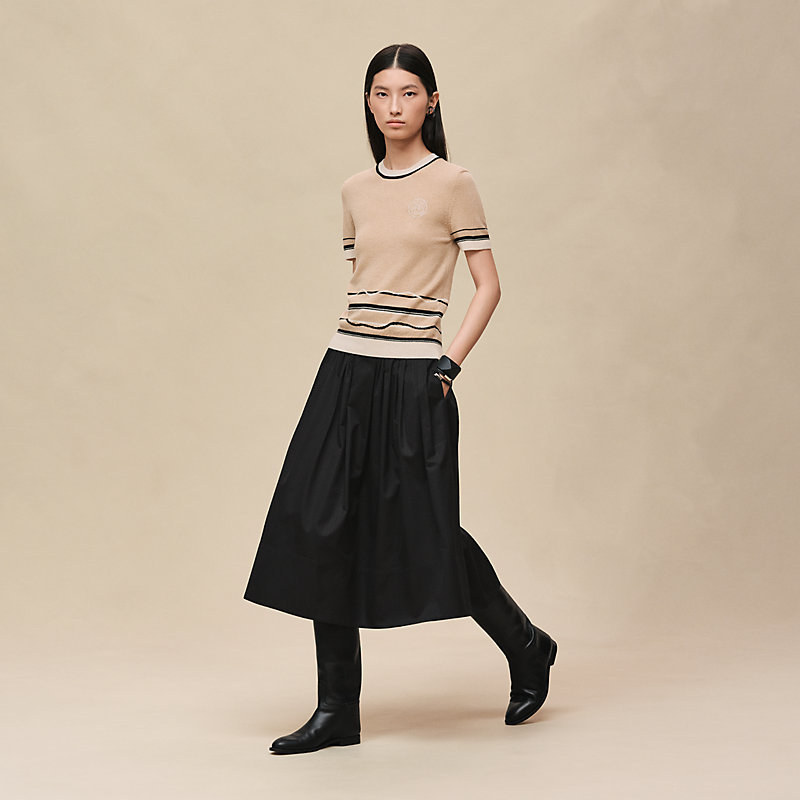 模特身高180厘米/5英尺9英寸,身穿38号。造型中的其他单品:- “Mosaique”腰封设计褶裥半身裙 (H6E0334DB02)- Jumping长靴 (H251353Z 02)