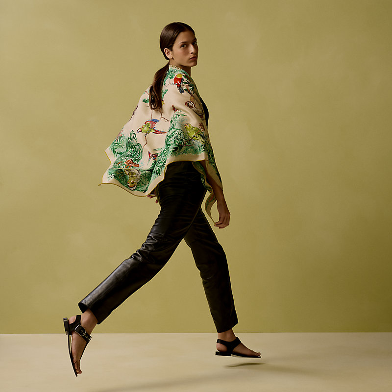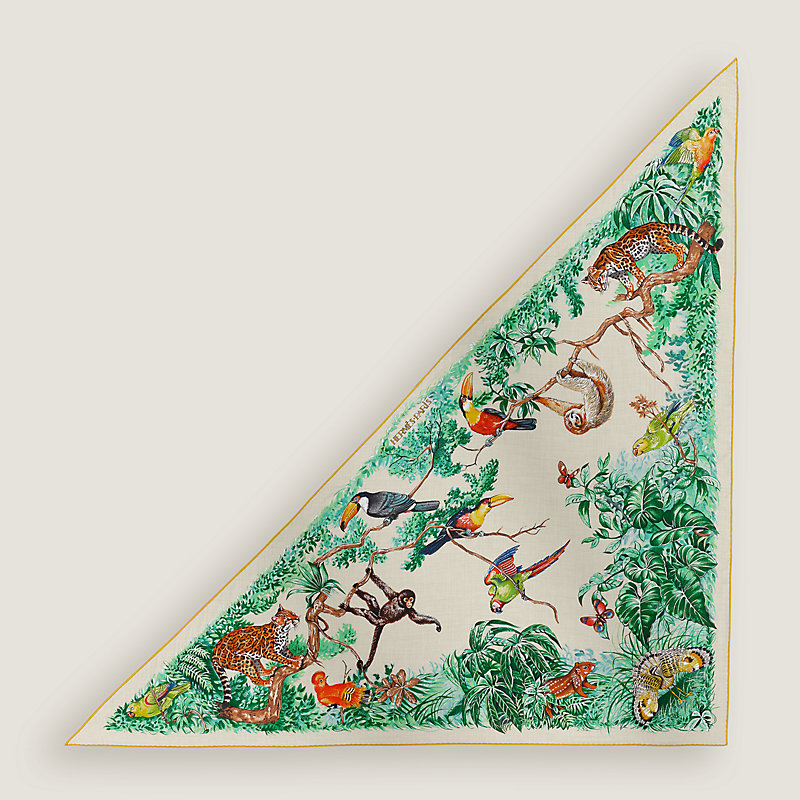 南美洲赤道地区拥有极其多样的动植物物种,无疑是地球上多样性最丰富的生态宝库之一。对于满怀热忱的博物学家、才华横溢的插画家和爱马仕的亲密合作伙伴罗贝尔·达勒(Robert Dallet)而言,这里是取之不尽的灵感源泉。优雅的猎豹、灵巧的猴子、色彩斑斓的金刚鹦鹉、巨嘴鸟及长尾小鹦鹉在这片野生热带丛林的三角冠盖下嬉闹游戏。