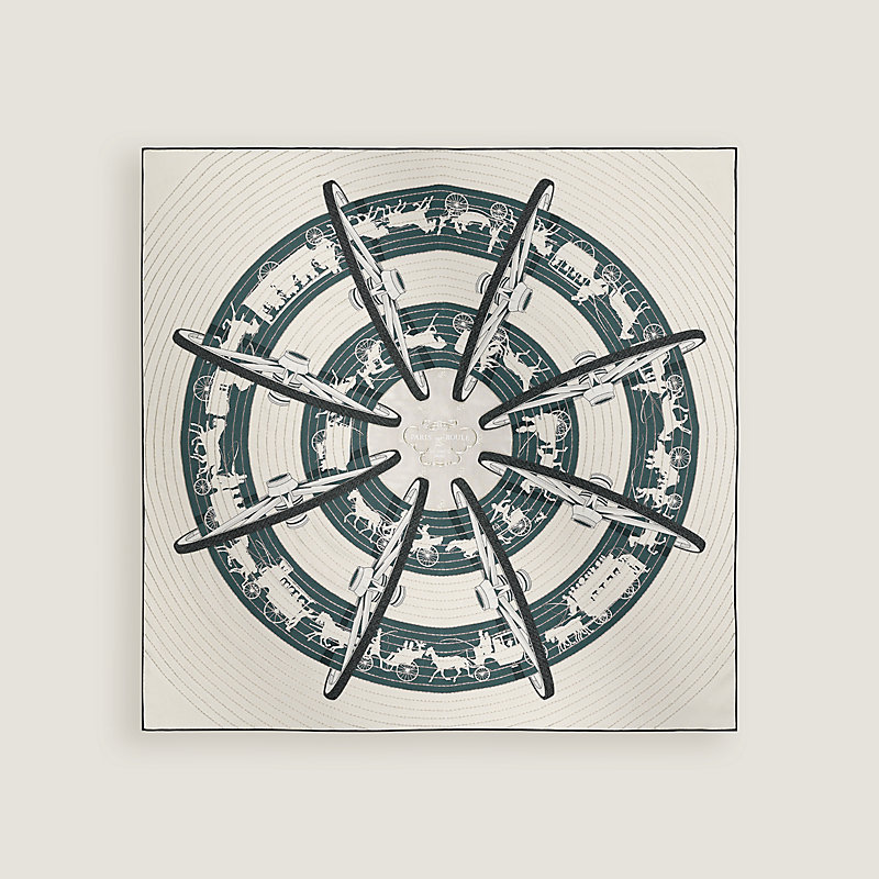 雨果·格里卡尔(Hugo Grygkar)笔下的马车精准细腻,栩栩如生,耳中仿佛能听到阵阵马蹄声和马车、驿车、双座四轮马车在巴黎的鹅卵石路面上轱辘作响的声音。马匹和车队仿若正在行进中,在这款大胆前卫的丝巾上列队游行。这一图案由艺术家于1951年创作,以充满活力的现代构图,令拿破仑三世时期的巴黎跨越岁月长河,跃然呈现于眼前。