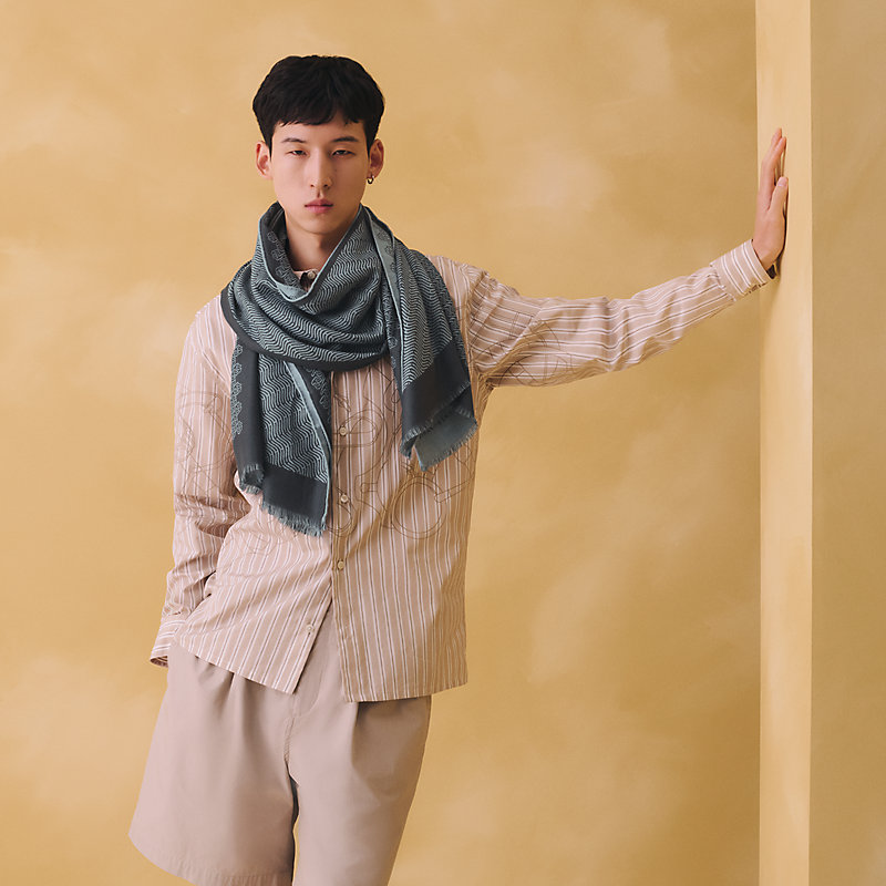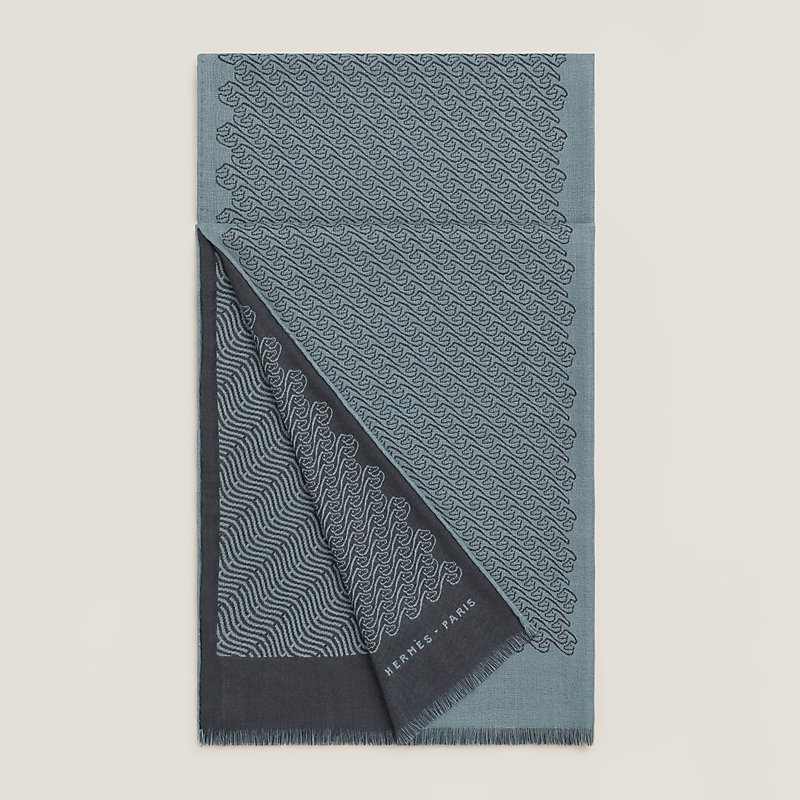 山羊绒和真丝混纺围巾(70%山羊绒,30%桑蚕丝)。这款双面围巾采用独特织法,生动呈现菲利普·穆盖(Philippe Mouquet)设计的两种波浪主题图案。