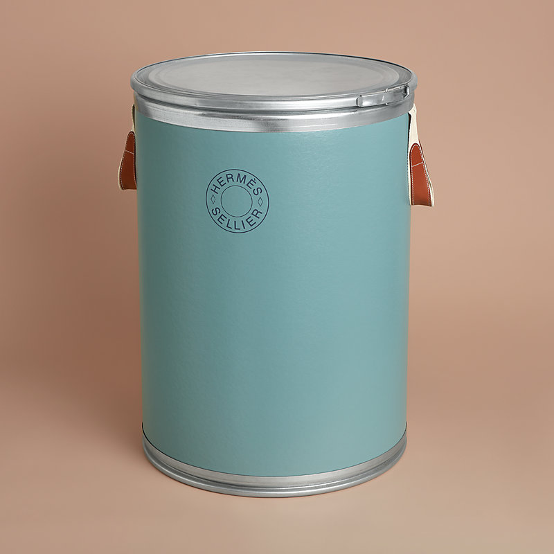 再生厚纸板鞍具收纳箱,外层包裹牛皮纸:- 轻盈耐磨帆布和牛皮提手。- “Hermes Sellier”字样标志- 金属箱盖